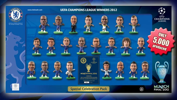 On 19th May 2012, at the Fußball Arena München, Chelsea became Champions of Europe by beating Bayern Munich in a thrilling and closely fought final. With the score at 1-1 by the end of extra time, Chelsea went on to win 4-3 in a dramatic penalty shoot out. Celebrate Chelsea’s historic victory with this special limited edition official collection depicting 23 figures of the winning squad. Included inside are manager Roberto Di Matteo and UEFA Man of the Match Didier Drogba whose final penalty kick would secure Chelsea’s place as Champions League winners 2012.
