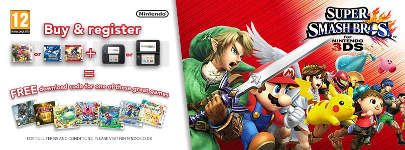 Register a copy of Super Smash Bros. for Nintendo 3DS* (releasing 3rd October), Pokémon Omega Ruby** or Pokémon Alpha Sapphire** (both releasing 28th November) with Club Nintendo between 3rd October 2014 and 12th January 2015 (23:59 local time), and fill out the software registration survey – a required action if the copy of the game is purchased at retail.