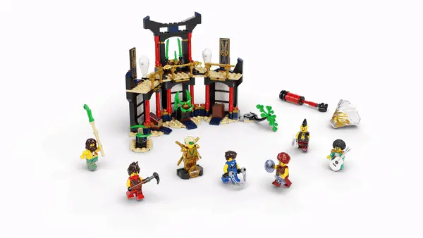 - Der Ninja-Tempel bietet eine Kampfplattform für spannende Duelle, eine rotierende Waffenplattform und eine sich drehende Waffe zum Üben von Ninja-Fertigkeiten sowie eine Sammlung von Jadeklingen, die als Preise vergeben werden.