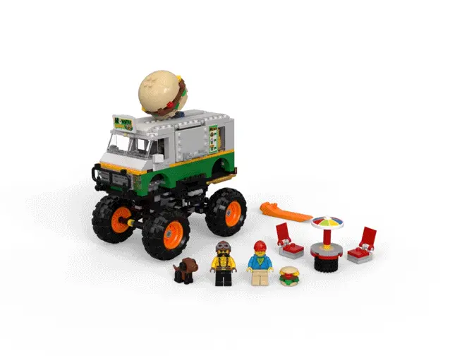 - Fans des phantasievollen Spiels werden dieses Set lieben. Der Monster-Burger-Truck mit riesigen Rädern, funktionierender Federung, klappbarer Treppe und einem riesigen gemauerten Burger auf dem Dach ist ein cooles Allround-Geschenk für Kinder ab 8 Jahren.
