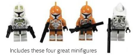 - Four Minifigures: Clone Commander, 2 Bomb Squad Clones and one ARF Clone